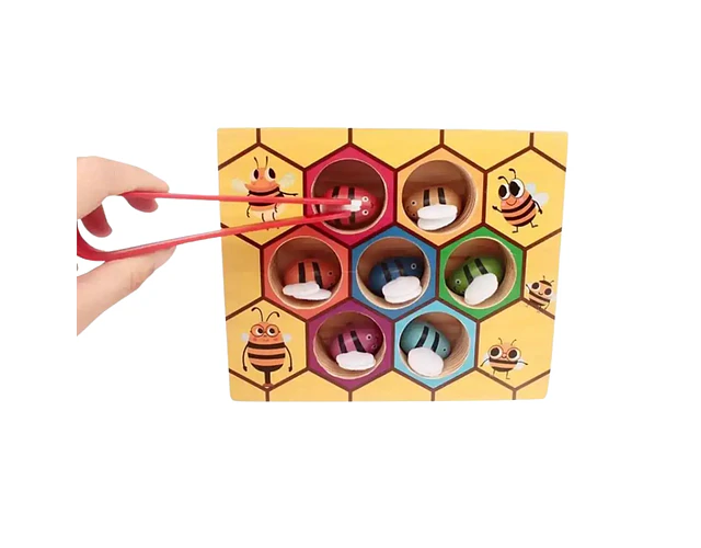 Colmena de abejas , fabricado en madera de alta calidad, pintura no toxica. Los niños pueden contar a las abejas con pinzas y ponerlas en el nido correcto con el mismo color. Tablero de madera Tamaño: 16.5 x 13.8 x 4 cm