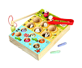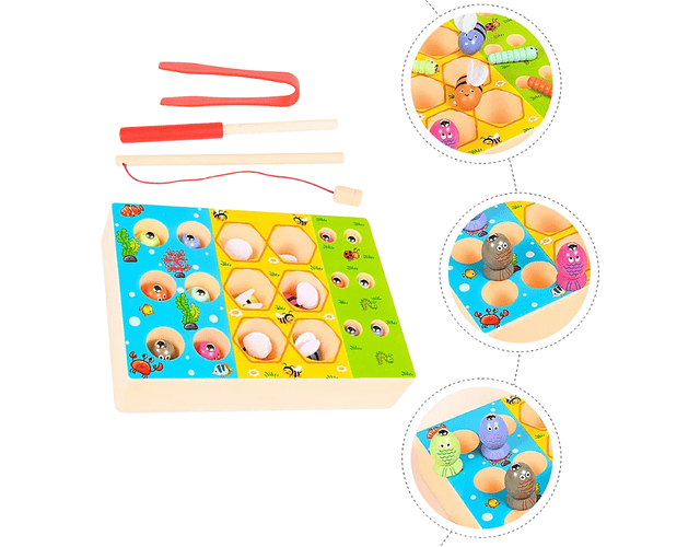 1 Base inferior de madera , 6 peces pequeños, 6 insectos pequeños, 6 abejas, 1 pinza de plastico y 1 caña de pescar con imán .