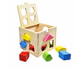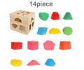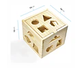 Caja juego de madera, contiene 13 formas geométricas diferentes para clasificar, cada forma está diseñada para encajar a través de un agujero especifico en el cubo.
