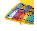 Metalófono de 25 teclas de metal con 2 baquetas plásticas. Viene en una caja estilo maletín plástico de color amarillo.