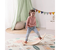 La tabla tiene una forma curva que la hace versátil y funcional. Su diseño permite a los niños usarla de múltiples maneras: como balancín, rampa, puente, tobogán, asiento, y mucho más. La curvatura está cuidadosamente diseñada para proporcionar un movimiento suave y seguro.